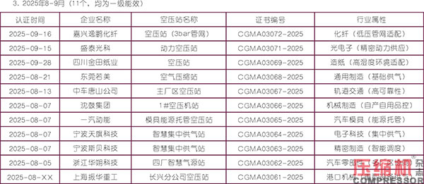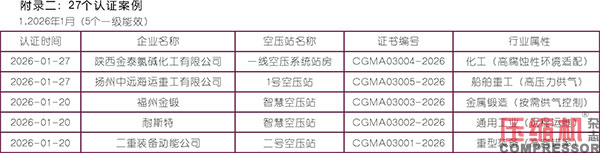 中國通用機械工業(yè)協(xié)會(CGMIA)發(fā)布的壓縮空氣站認證公示數(shù)據(jù)顯示,2025年8月-2026年1月共公示27個認證案例,其中一級能效22個、領先型5個,覆蓋12個省份/直轄市,工業(yè)密集區(qū)(長三角、珠三角)占比超60%。這為我們分析未來空壓機站的發(fā)展趨勢提供了重要依據(jù)。